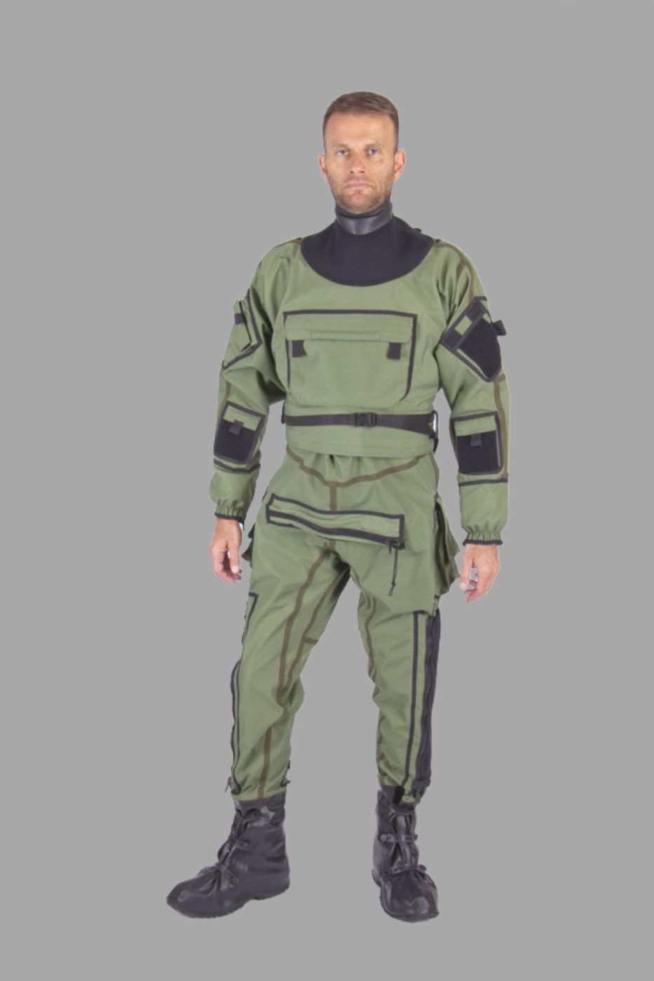- The suit is made from breathable, waterproof polyamide fabric in green NATO color.